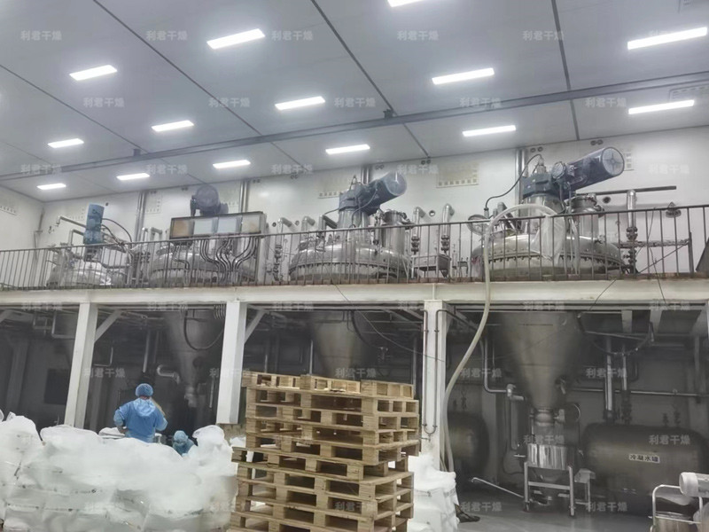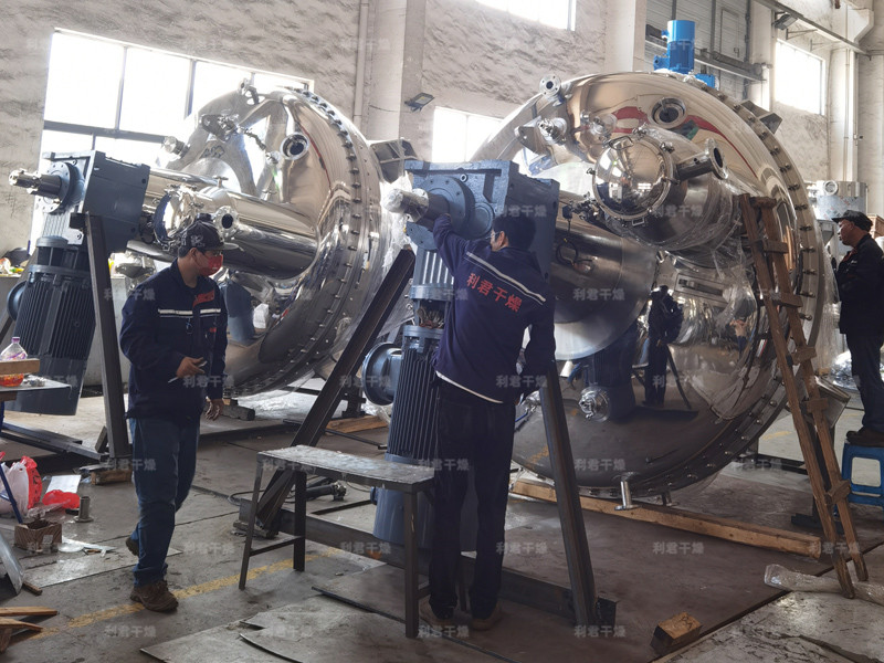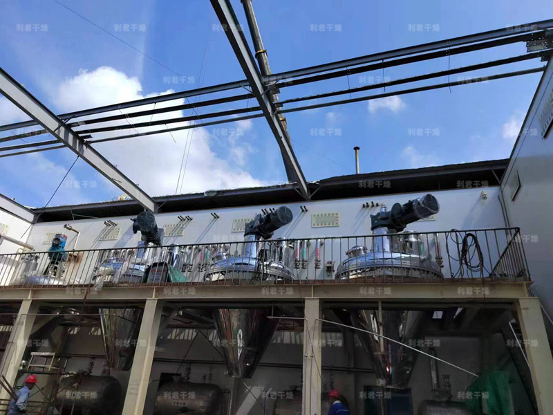 ●干燥階段:濾餅脫水后,通過回轉(zhuǎn)使濾餅疏松,同時,夾套內(nèi)蒸汽對內(nèi)壁進(jìn)行加熱,通過熱傳導(dǎo)對濾餅進(jìn)行加熱升溫,濕份迅速蒸發(fā)達(dá)到干燥的效果。通過設(shè)備內(nèi)抽真空的方法加快蒸發(fā)速度。通過加入處理后的熱氮氣等介質(zhì)帶走蒸發(fā)的濕份,可加速物料的干燥,提高干燥效果。